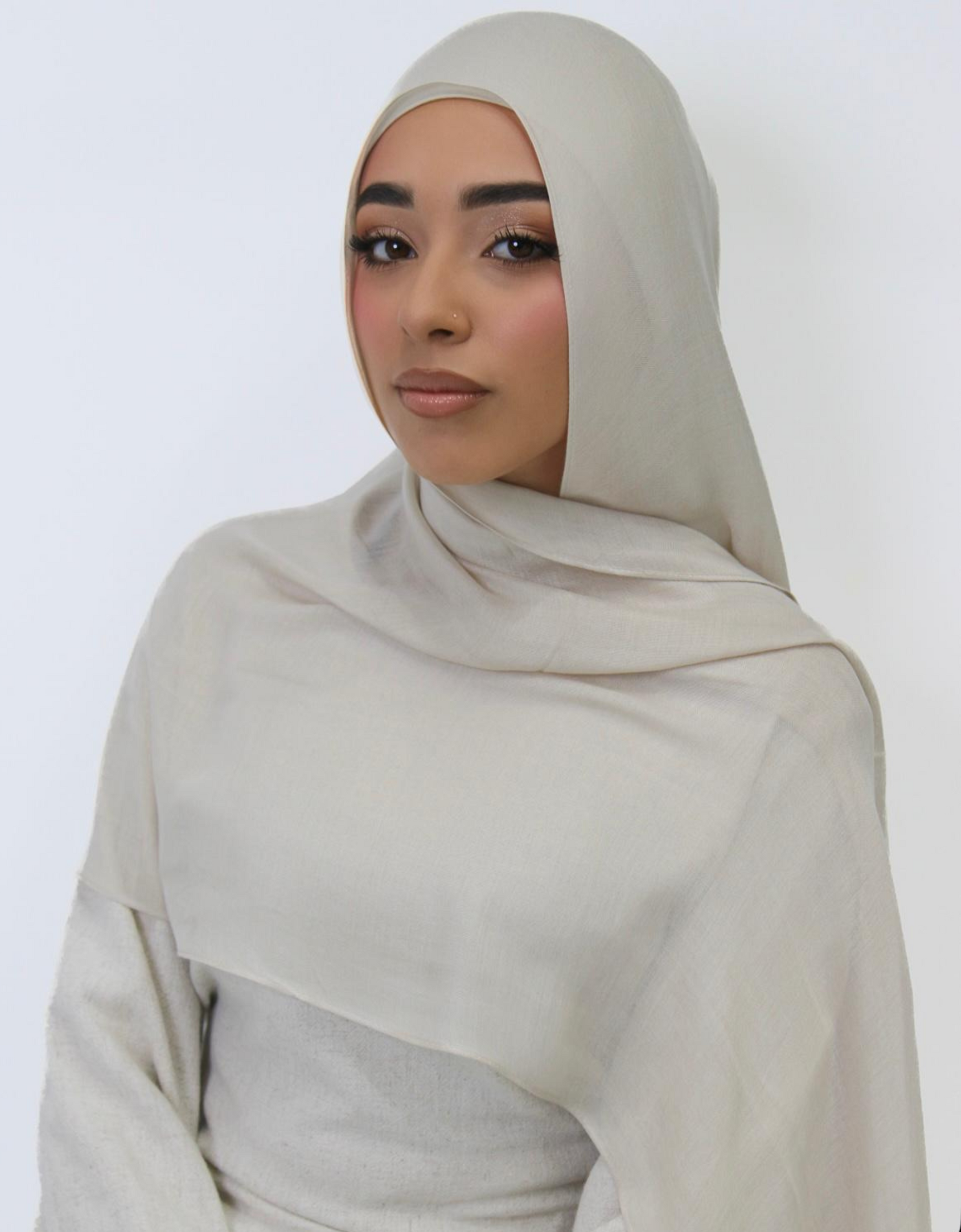 A soft cream shade — pure, light, and classic. A fresh neutral that works beautifully for layering or minimal styling. Comes with matching cap (Single-stitched hijab)